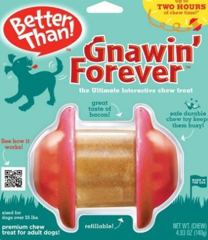 There is a rawhide bone in the middle that spins so when the dog starts to eat it, it is difficult to get at. The toy is designed to force the dog to use his front teeth instead of his back teeth which is apparently why it takes him so long to get at the goods. The rawhide part is replaceable implying this toy can last “forever,” hence the name.